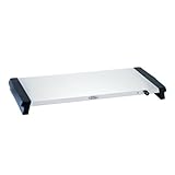 Tray is very sleek and attractive. Handles are nice and low so that they do not interfere with dishes placed on tray. The cord is a quite short but that is probably a safety feature. It would impossible to use without an extension cord unless it is sitting on a kitchen counter top. It is exactly what we needed.
